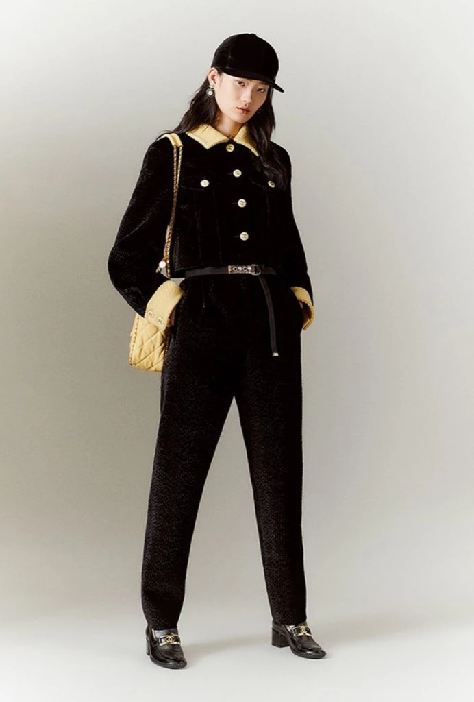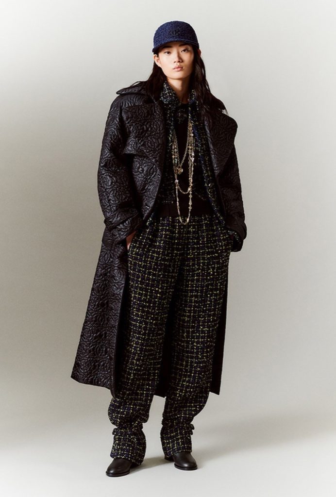 Sus siluetas mezclaban tweeds con prendas de cuero y denim, incluido los total looks. Los combinó con botas de goma estampadas con un logotipo de doble C, o zapatos negros de taco bajo, guillerminas y botas con taco chino.