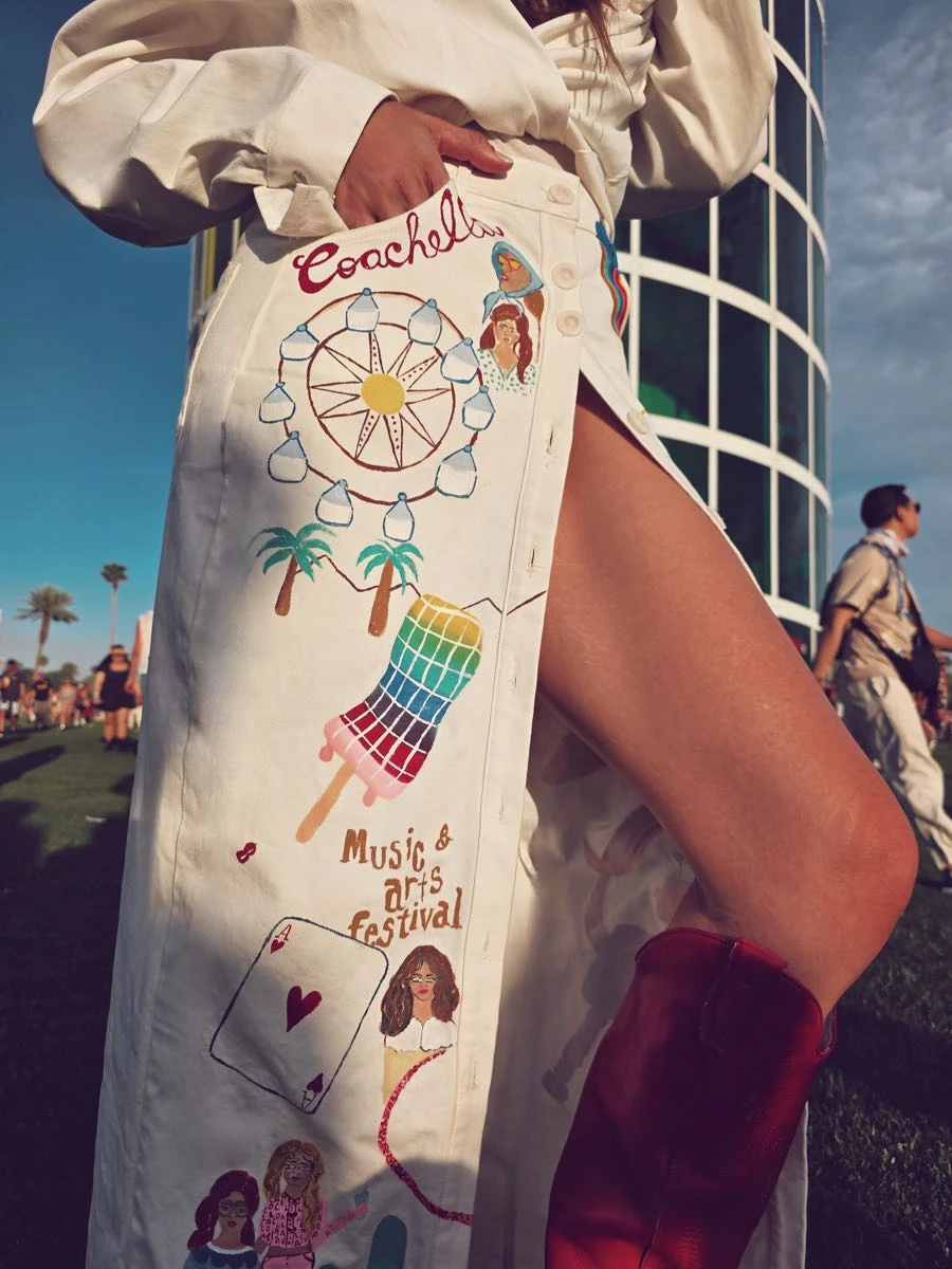 Uno de los momentos más especiales de su paso por Coachella fue cuando compartió en redes el look que ella misma intervino con sus dibujos, esos que ya son su sello personal. En un set blanco, camisa oversized, pollera recta y remera, Ana plasmó sus ilustraciones, logrando una prenda única, cargada de identidad, arte y estilo.