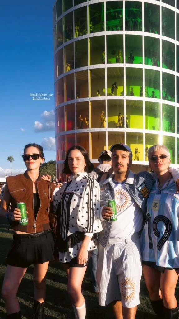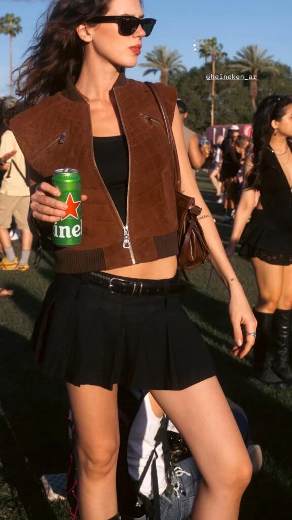 Delfina lució gafas de sol negras de líneas clásicas, cinturón fino y botas altas, reforzando ese aire edgy que define su impronta. El beauty look acompañó en clave natural, con pelo suelto y makeup fresco, ideal para resistir el calor del desierto sin perder estilo. Con esto, Chaves demuestra que sabe adaptar su estilo a la tendencia de los festivales.
