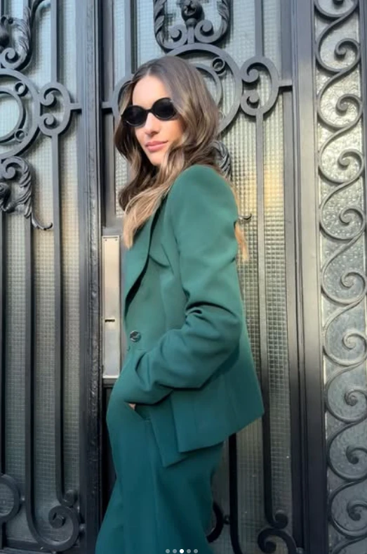 Este outfit es perfecto para la oficina, una cena o un evento semi formal. Además, confirma que el verde oscuro es una alternativa chic al negro, que ilumina y estiliza a la vez.o que el vestido hablara por sí solo.