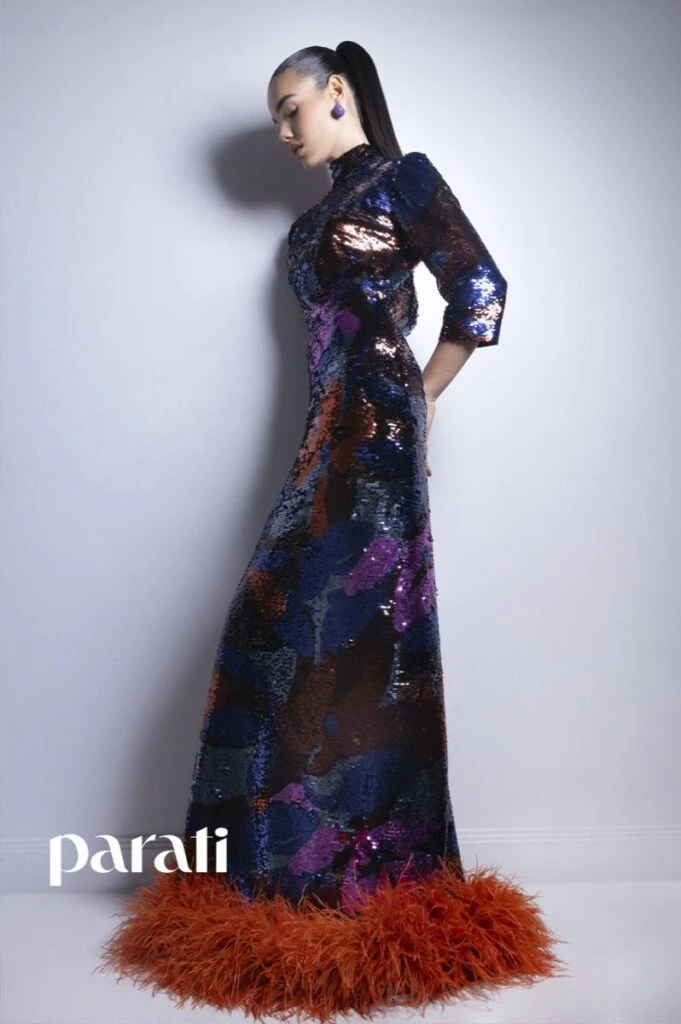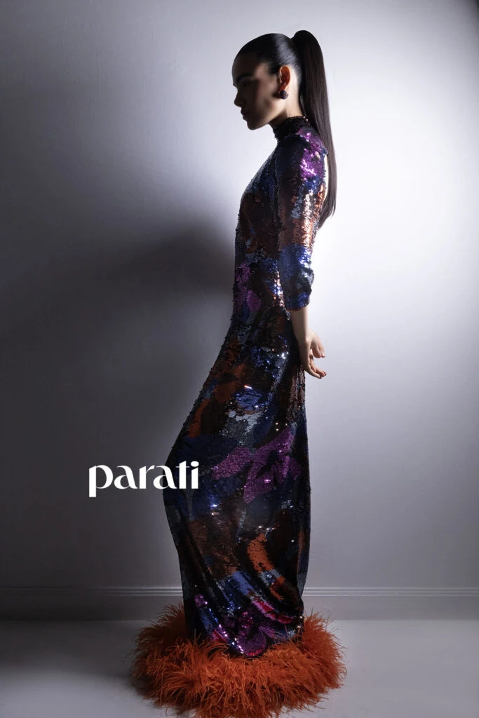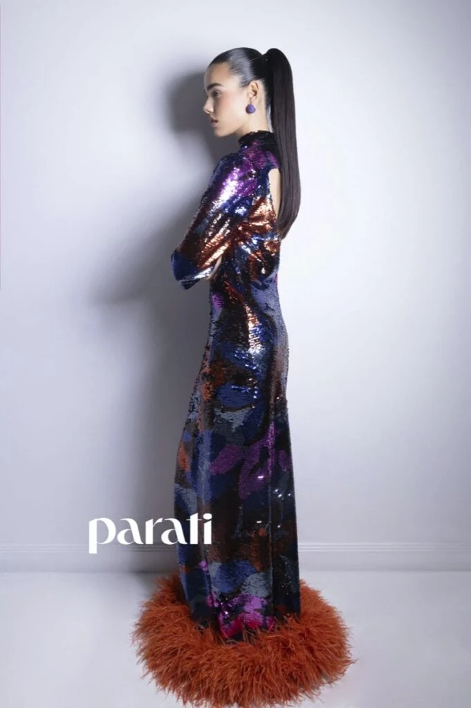 Una alfombra roja, una gala o la fiesta de tus sueños cumple con todas las expectativas en este vestido que brilla aún con poca luz. Las pailletes multicolores forman una estampa con aires pop y se llevan de perlas con el ruedo de plumas que cobran vida al caminar. Un vestido que atrae y multiplica las miradas en cada paso.