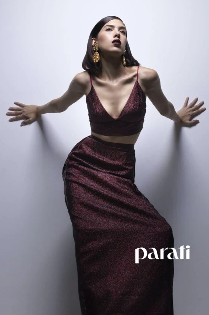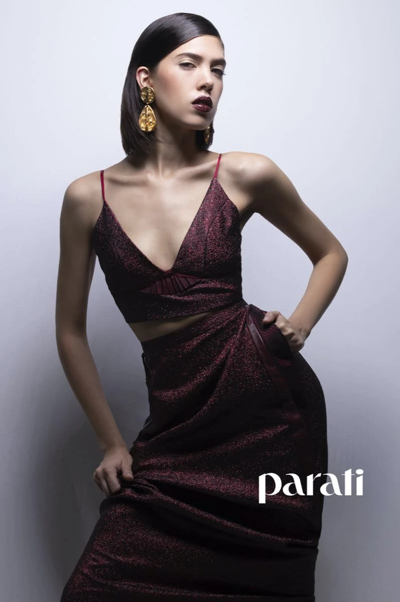 Top y maxifalda de brocato y lurex (@fabianzittaofficial). Aros colgantes de metal dorado (@losvadosdelisen).Noches burgundy.