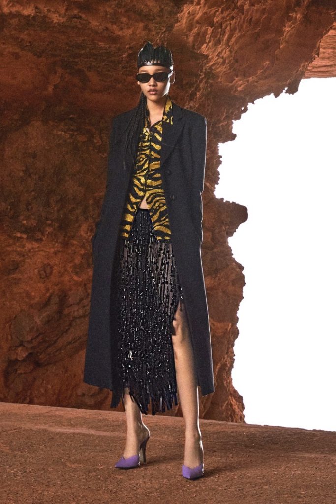 Debajo de un maxi suéter envolvente tejido a mano, aparece el minivestido "brillante" bordado de lentejuelas, por ejemplo.
