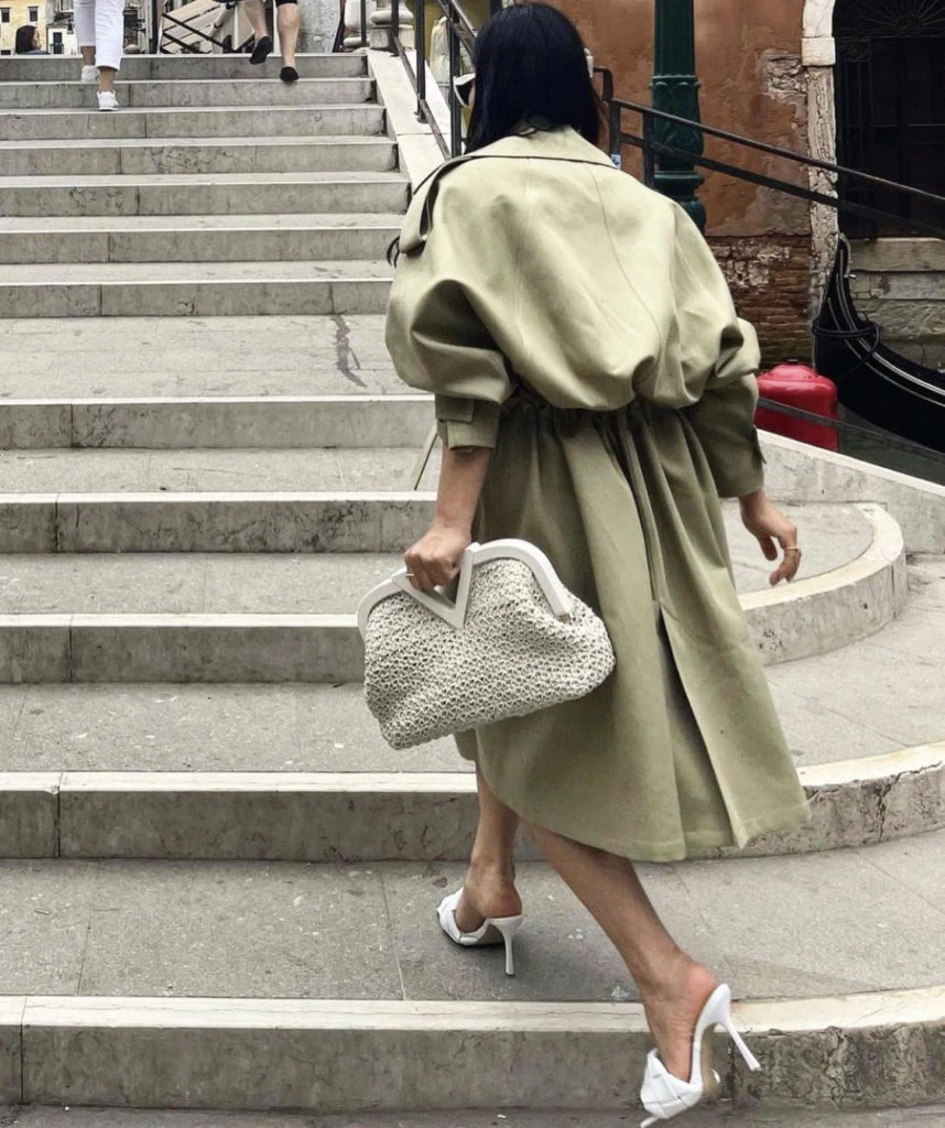 Los trench son una pieza clave para la primavera, es abrigado pero no tanto, y nos protege de los cambios de clima característicos de la temporada. Esta versión es en lino verde y tiene las mangas XL como protagonistas. ¿El detalle? El sobre tejido en color blanco que hace juego con los zapatos. Un look más que apto para la ciudad.