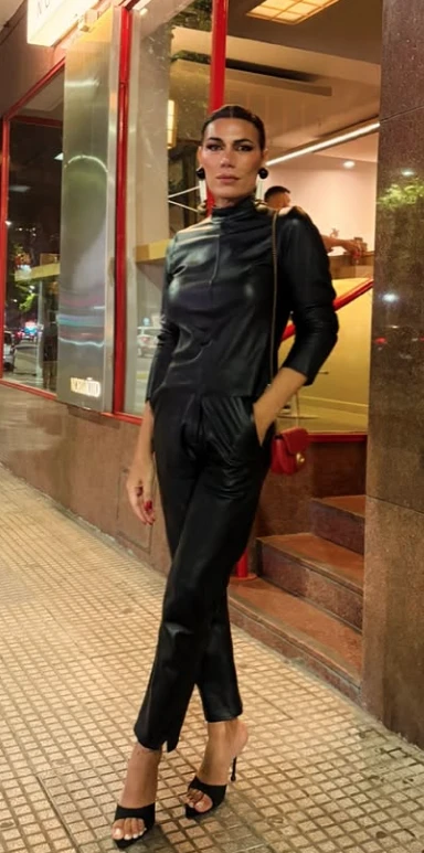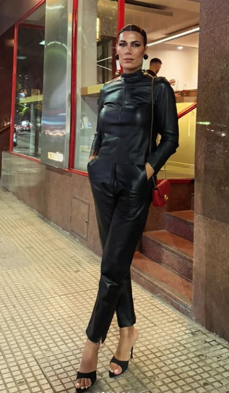 Flor de la V apostó por un conjunto íntegramente de cuero negro compuesto por una camisa estructurada de cuello alto y mangas largas, combinada con un pantalón recto de tiro alto que estiliza la silueta. El acabado levemente brillante del material aporta sofisticación y una impronta moderna, mientras que el corte limpio y sin excesos de herrajes mantiene el look elegante y minimalista.