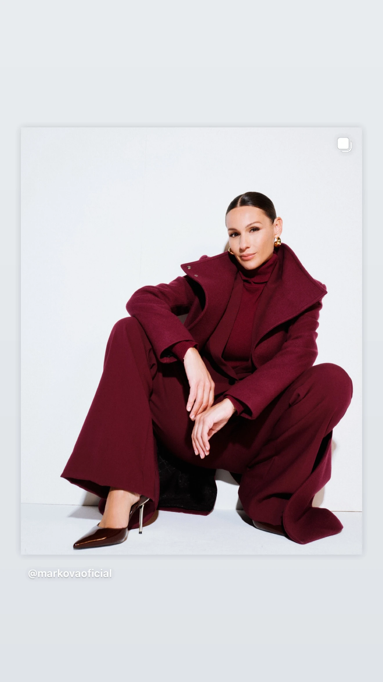 El conjunto elegido por la modelo y conductora está compuesto por un pantalón sastrero, un tapado, suéter de cuello alto y stilettos con taco metálico, todos en la misma paleta borgoña intensa. ¿El resultado? Una silueta estilizada y poderosa, sin necesidad de estampas ni sobrecarga de accesorios.