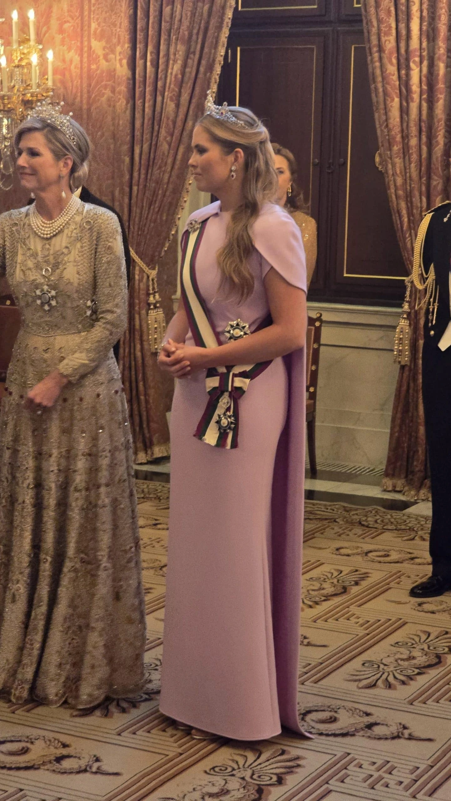 Amalia acompañó el elegante vestido con piezas del impresionante joyero de su madre. Usó por primera vez la tiara Mellerio (hasta ahora solamente la había usado Máxima) que mandada a hacer por el rey Guillermo III de Holanda, para su esposa, la reina Emma.