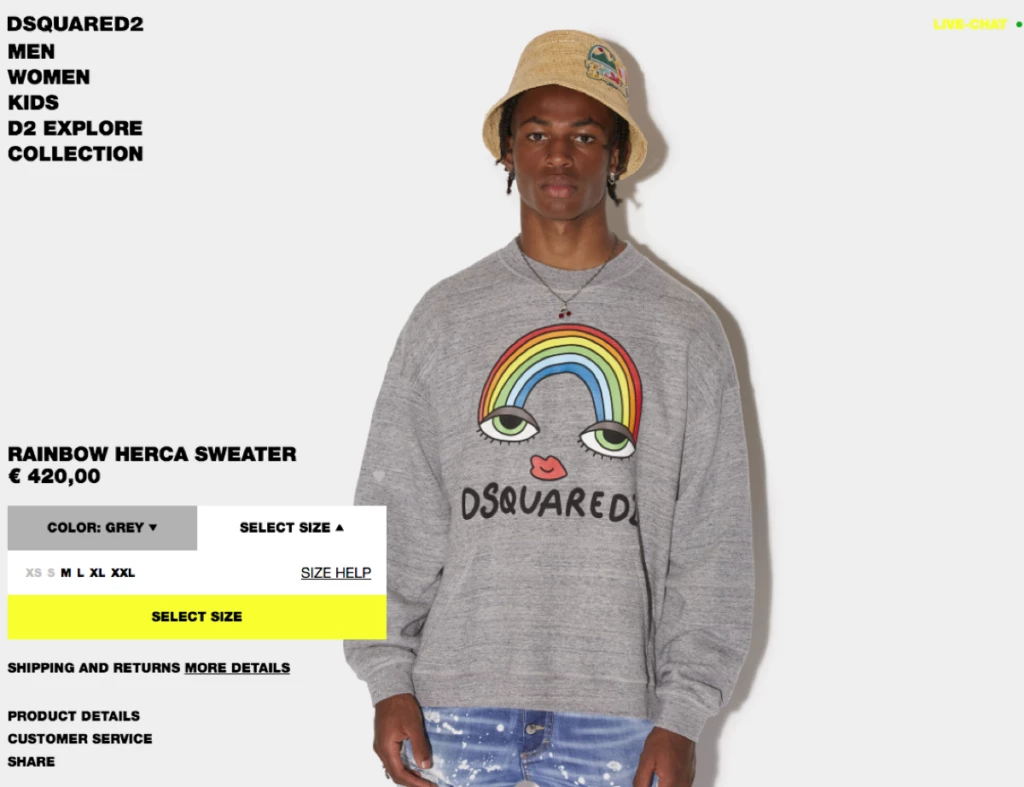 El protagonista de su look fue el buzo con estampa de arco iris de la marca Dsquared2, de los gemelos canadienses Dean y Dan Caten.