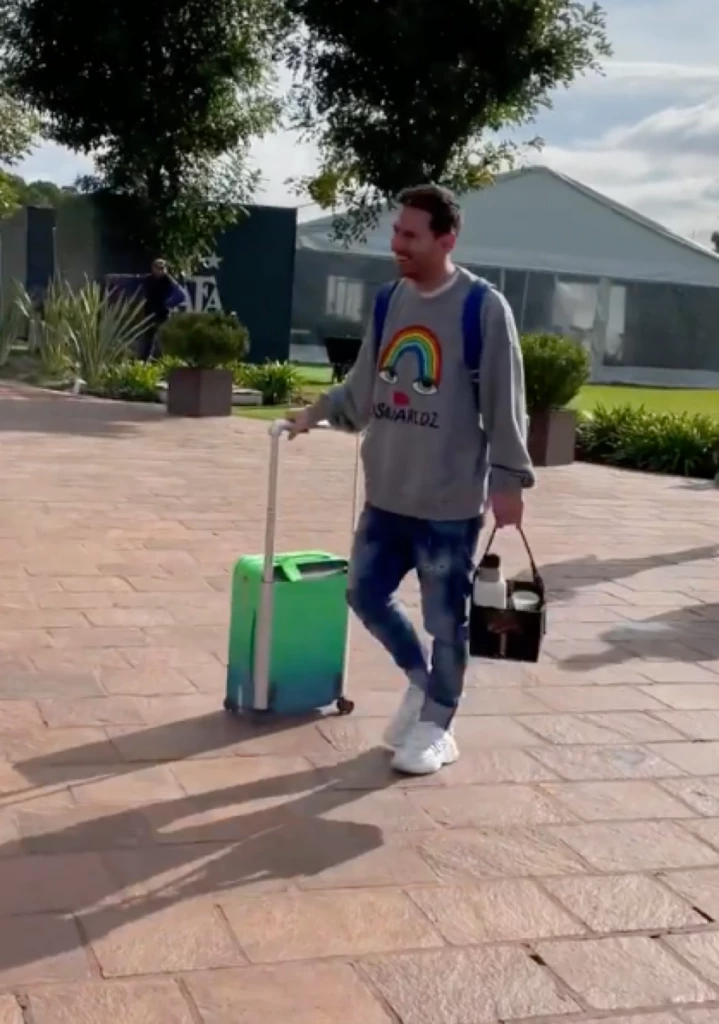 Messi arribó con un look muy canchero compuesto por un buzo gris melange con estampa, jeans con roturas y lavado localizado y zapatillas blancas. Sumó su infaltable bolso de cuero para el mate y un carry on de Louis Vuitton.
