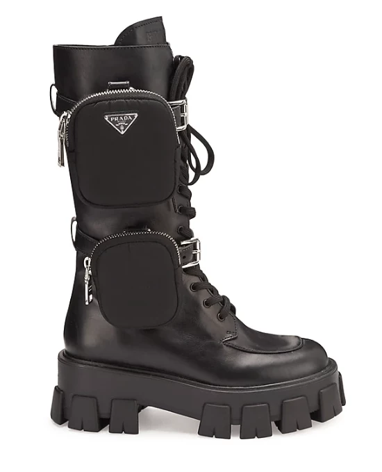 En los pies adoptó unas botas de combate o borceguíes muy modernos de la firma Prada que tiene la particularidad de tener una suela de tractor alta y gruesa, cordones centrales y dos carteras qu ese adaptan a la pierna.