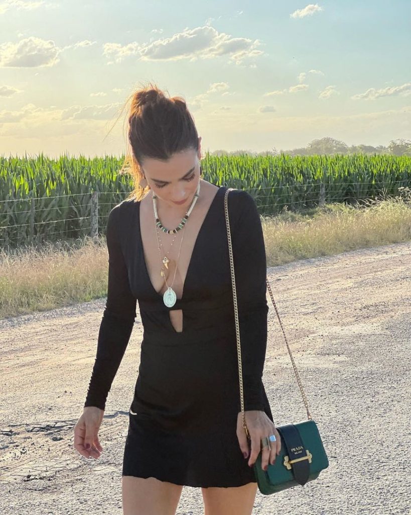 Agustina Cherri asistió a un casamiento en el campo y para ello adoptó un look acorde al lugar: vestido corto, texanas y collar con cadenas. Pero la protagonista indiscutida de su look fue una cartera de una marca internacional que se llevó todas las miradas.