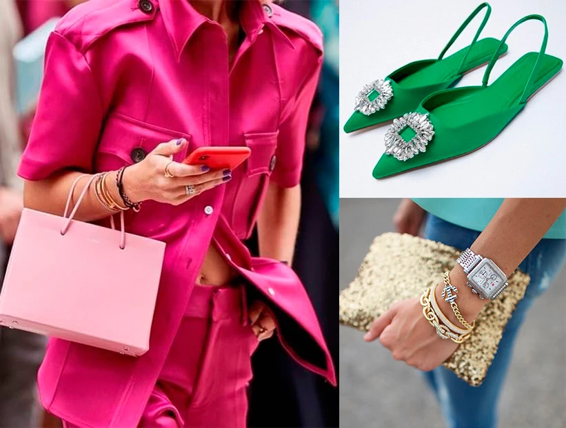 - Glitters, strass y otras aplicaciones brillantes son motivos de festejos en sandalias, carteras. Bijou poniendo glam a tu look.
