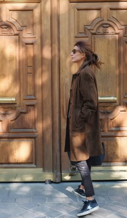 El tapado de gamuza, es uno de sus preferidos. Liviano, con movimiento y textura, se adapta tanto a la ciudad como al campo. Juliana lo lleva con básicos neutros, logrando un estilo relajado y sofisticado al mismo tiempo. Es un abrigo de media estación por excelencia: liviano, versátil y elegante.