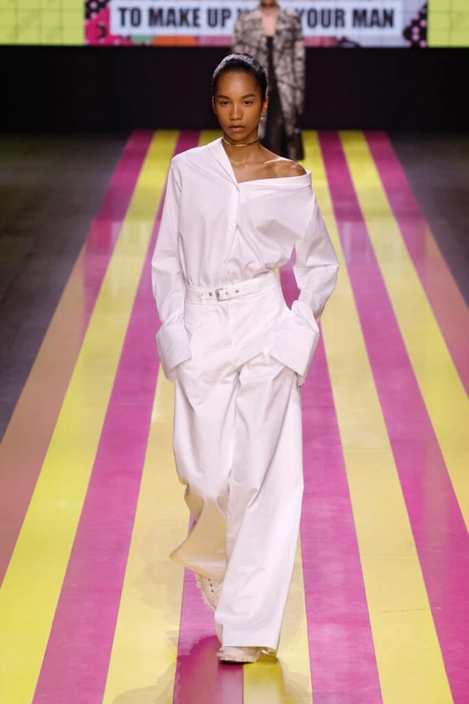 También hubo lugar para las camisas blancas, que protagonizan la gran mayoría de los looks de la colección, y que se presentan de manera minimalista y oversize, con solapas estrechas; de escote irregular, o vistas a través de vestidos descontracturados.