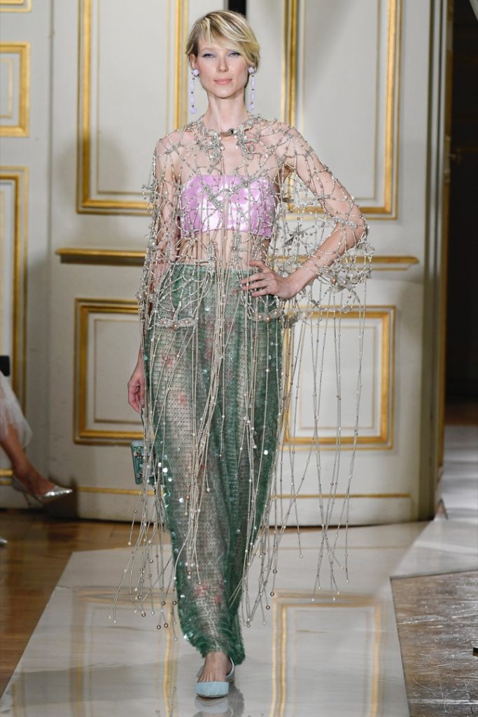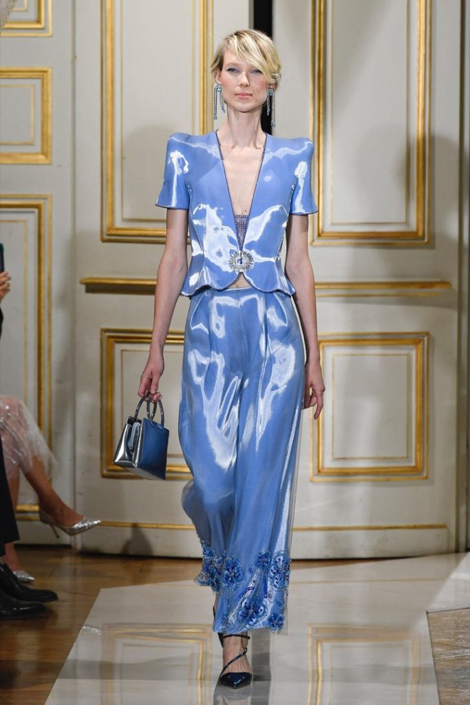 La organza de seda fluida y brillante se mueve en los diseños como un holograma. Armani lo trabajó en pantalones y vestidos, agregando su filtrado característico, es decir, capas de tela transparente, para crear sobrecargas sensoriales tan vibrantes y efervescentes que llegaron directamente a la cabeza.
