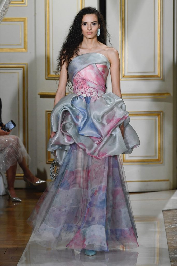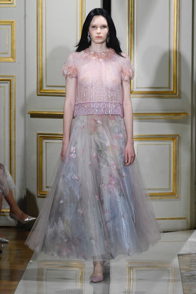 Sumó bordados florales relucientes y lentejuelas acuosas en una paleta de pasteles frescos.Transformó esos colores y texturas en vestidos alegres, rígidamente escalonados.