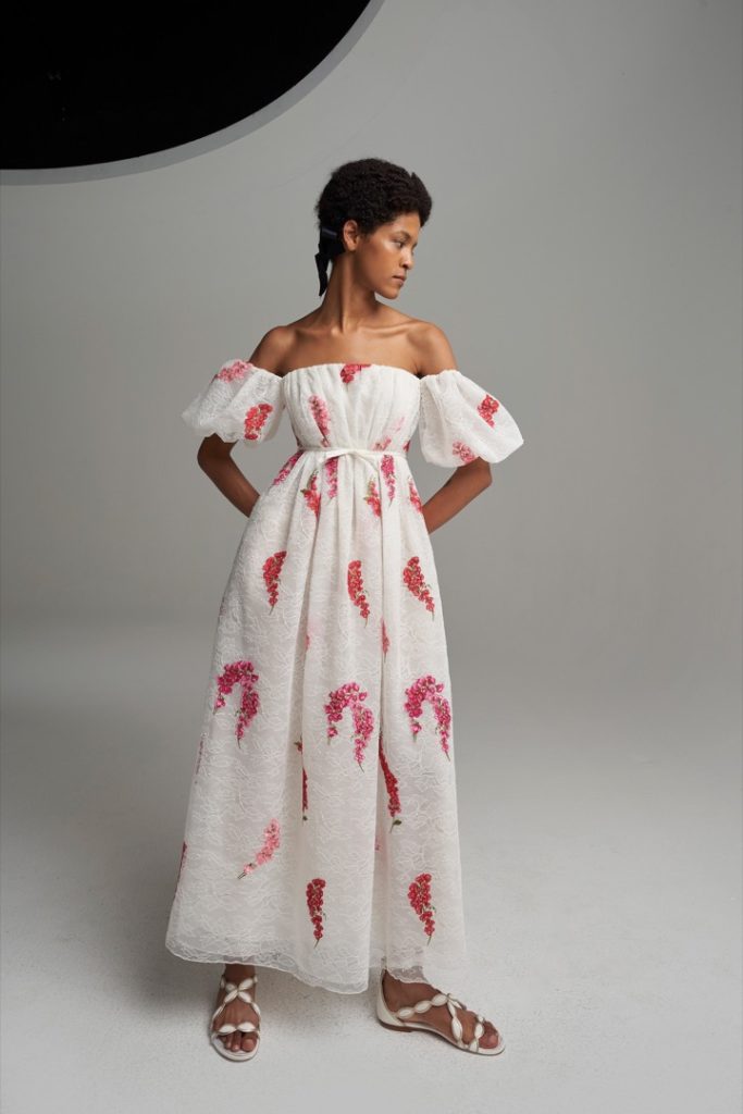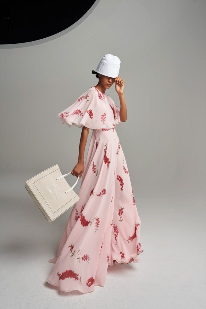 La colección utiliza colores suaves como rosa claro, rojo, blanco y celeste, junto con estampados florales, lunares y volantes. Y a los vestidos fluidos, Valli le sumó un toque masculino con trajes y blazers.