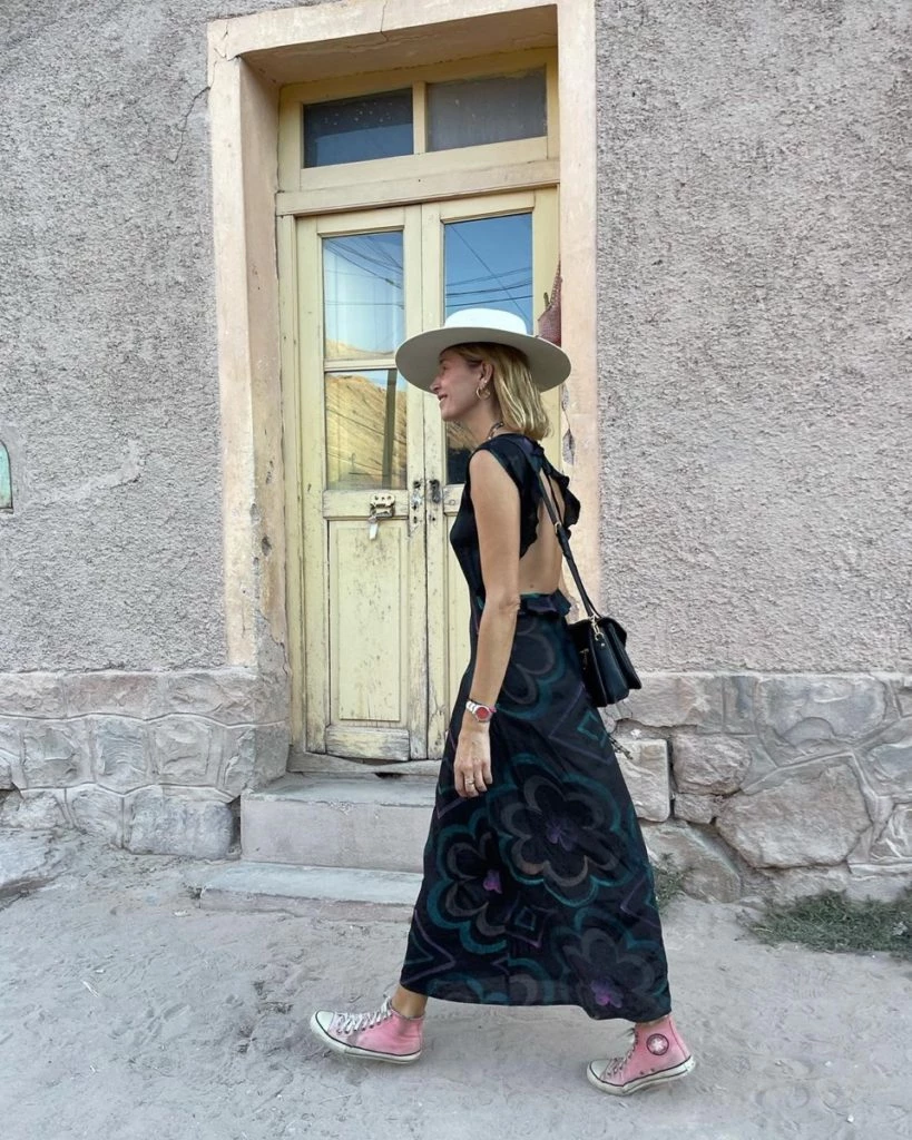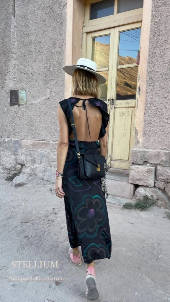 En un paseo por el Norte Argentino, Dolores llevó un vestido estampado con escote cerrado, volados en los hombros y una gran abertura en la espalda revelando su piel al descubierto.