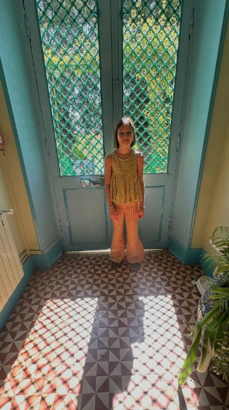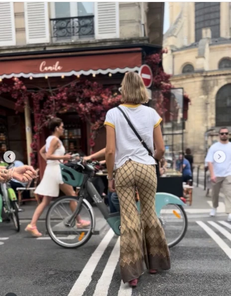 Indra apostó por una versión más juvenil del mismo estilo. Llevó un pantalón oxford rayado y lo combinó con una blusa sin mangas con estampa de flores, aportando un aire desenfadado y cómodo, ideal para recorrer las calles parisinas.