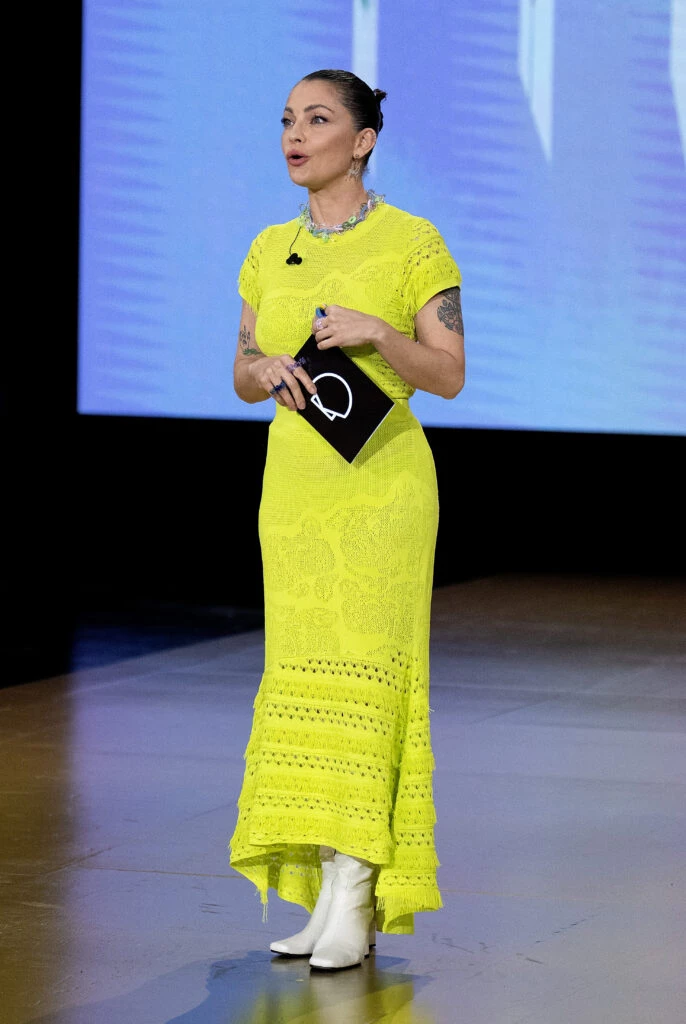 La actriz y directora sorprendió en la red carpet con un look folk en color verde lima integrado por remera y pollera de largo irregular y detalle de guardas en tejido de punto, estilismo de la diseñadora Jazmín Chebar.