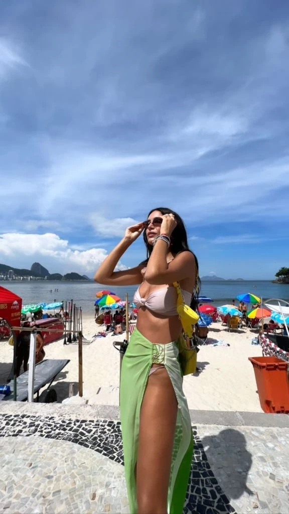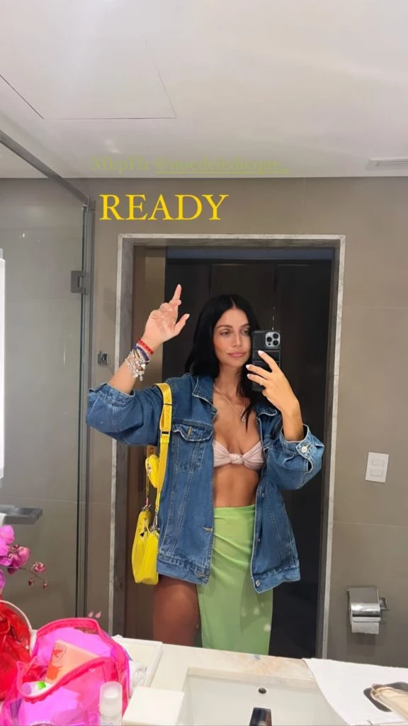 En cuanto a su calzado, eligió unos zapatos de plumas verdes, con correa en el tobillo y taco medio, de la firma Zara. Por otro lado, usó accesorios varios: múltiples pulseras estilo boho y un colgante de plata con dije de corazón, además de unas gafas de sol. Pero, sin duda, el más llamativo fue su bolso crossbody amarillo de Prada.