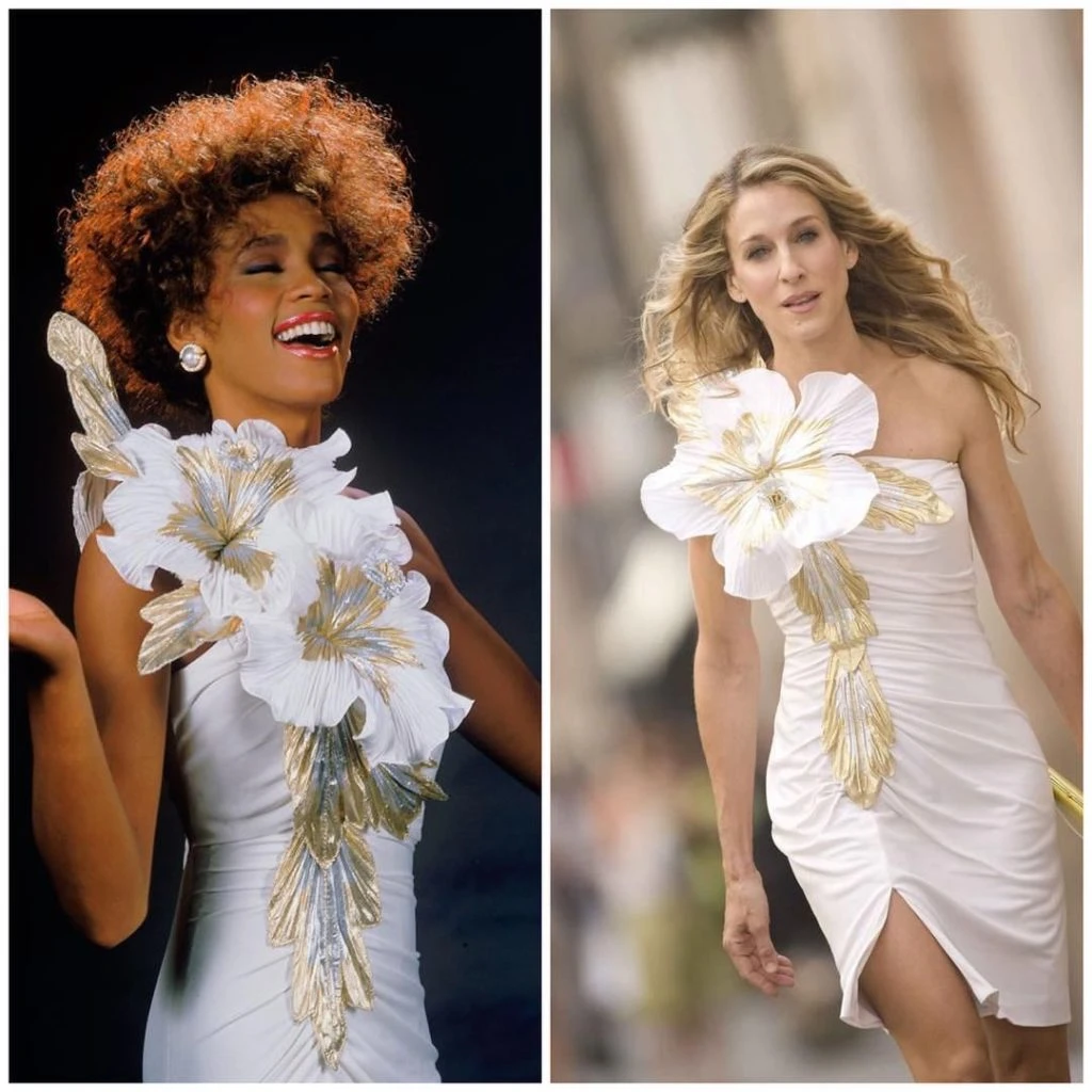 Lo que no muchos saben es que no sólo la flor sino el vestido utilizado por el personaje de Parker en la película fue un homenaje a Whitney Houston. La cantante lo había usado en un concierto de Los Ángeles a fines de la década del ochenta, un diseño de Eugene Alexander