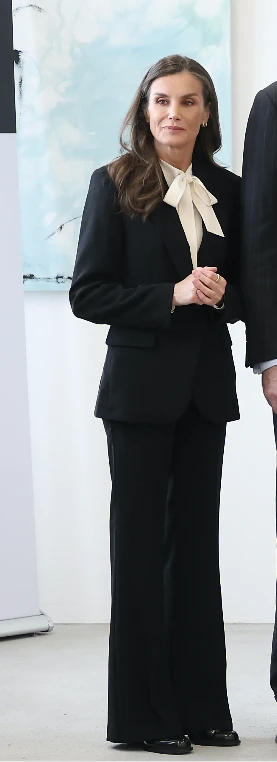 Para la ocasión, Letizia llevó un traje sastrero negro de dos piezas, clásico y perfectamente entallado, compuesto por saco recto y pantalón de pierna ancha. Un conjunto que transmite autoridad, sobriedad y seriedad, adecuado para un evento de memoria histórica de enorme peso simbólico.