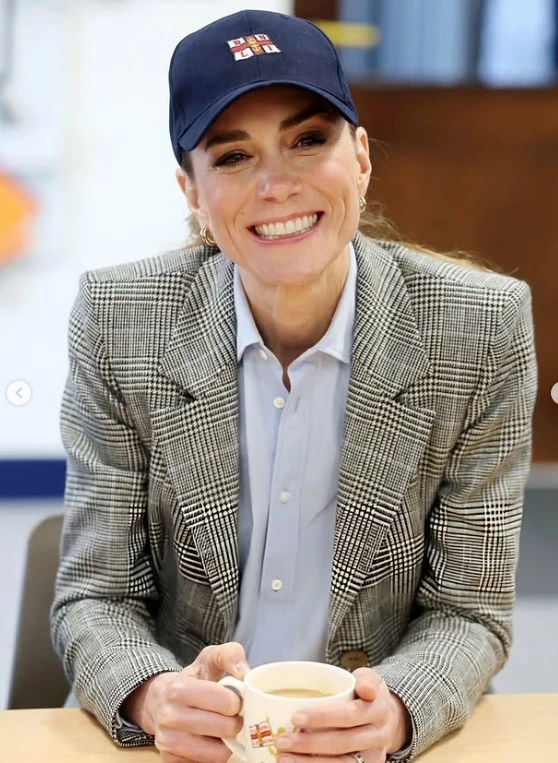 Durante una visita junto al príncipe Guillermo a la estación de botes salvavidas RNLI Tower Lifeboat Station, donde se reunieron con voluntarios y trabajadores que realizan tareas de rescate en el Río Támesis, Kate apareció con un look relajado que incluía blazer, camisa y gorra deportiva.