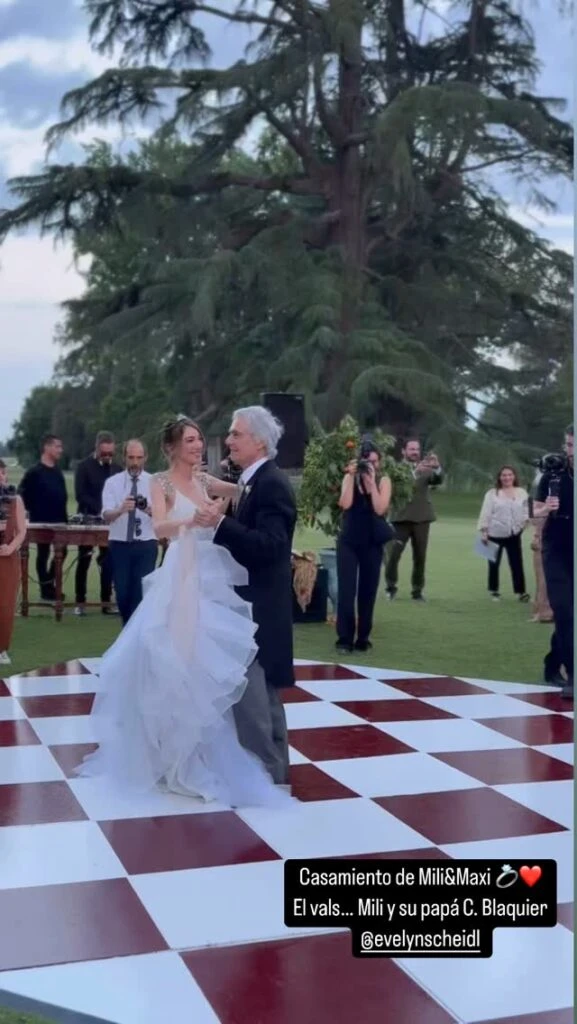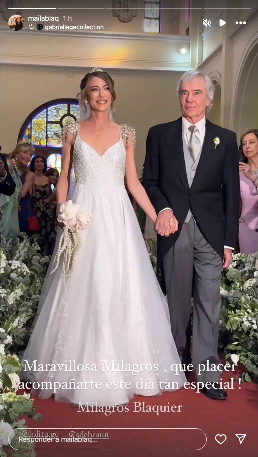 "Maravillosa Milagros, qué placer acompañarte en este día tan especial", escribió el diseñador en un posteo de redes que la novia republicó. En ese video se la ve resplandeciente, entrando a la iglesia de la mano de su papá, Charlie Blauquier.