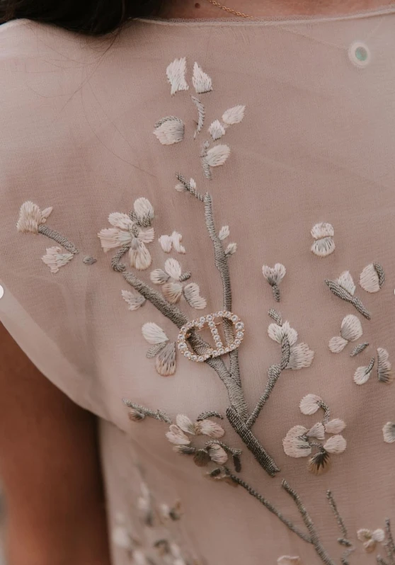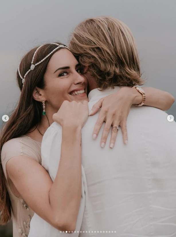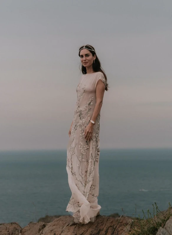 El diseño se adapta perfectamente a su cabello suelto con ondas naturales y a la estética etérea del vestido Dior bordado en tonos nude y suaves. Combinado con unos aros largos con esmeraldas, el tocado suma elegancia sin quitar protagonismo al vestido, creando un equilibrio perfecto entre lo sofisticado y lo relajado, ideal para una celebración frente al mar.