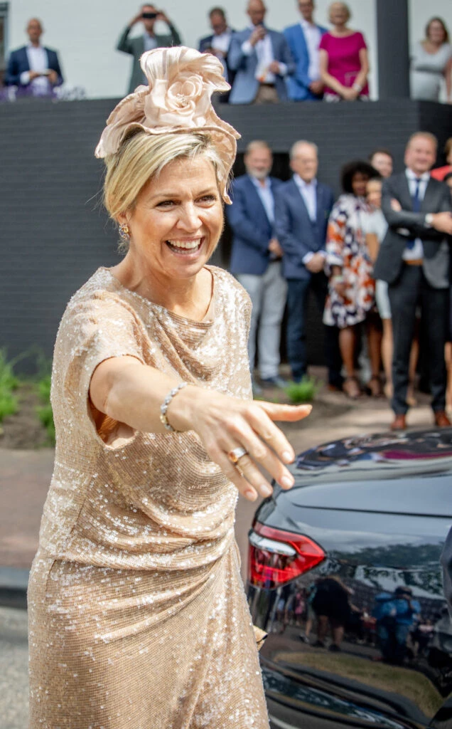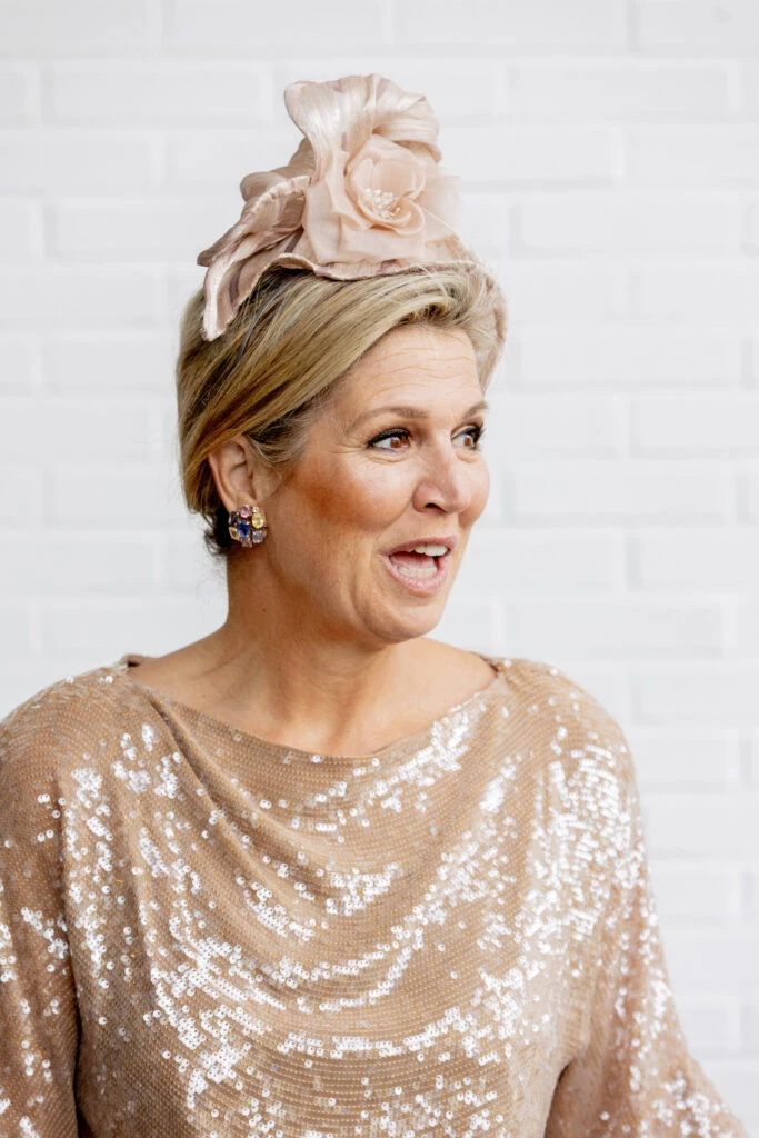 Máxima Zorreguieta volvió a causar impacto con su look. La reina de Países Bajos asistió este martes a un encuentro con empresarios con un outfit muy shiny integrado por una pollera y remera drapeada de lentejuelas en color champán de una de sus firmas preferidas, Natan Couture.