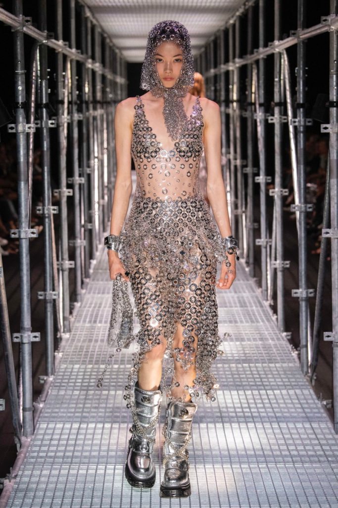 La colección tiene claramente referencias punk: slips grunge, faldas escocesas punk, tiradores y petos fetichistas e impermeables fáciles de limpiar, cruzados con la malla plateada característica de la casa.