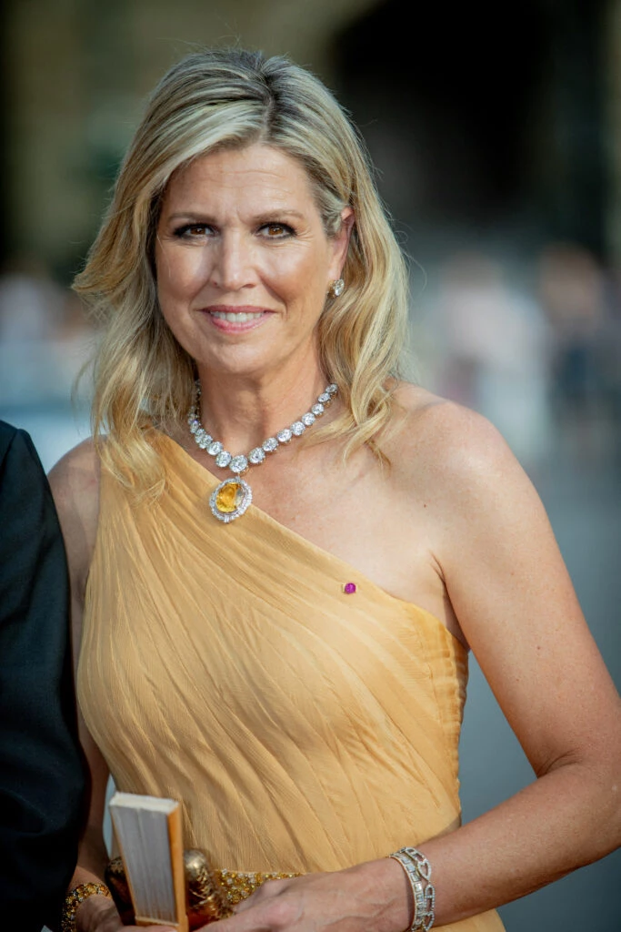 Pero lo que más llamó la atención del estilismo de Máxima fue su collar de diamantes del cual pendía un gran citrino, rodeado también por diamantes más pequeños, a juego con un brazalete y aros de diamante.