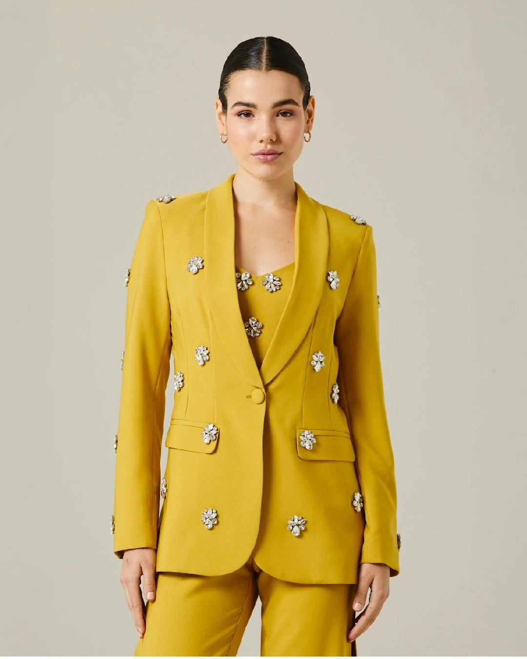 El conjunto de Natalia Antolín está compuesto por un saco smocking de creppe sastre con apliques bordados de piedra cristal. De acuerdo a la descripción de su página web, posee un corte estructurado y resulta una pieza elegante y sofisticada.