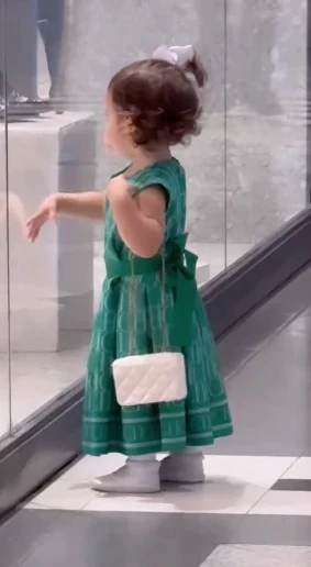 La hija de la modelo deslumbró con un vestido de fiesta firmado por Carolina Herrera. En concreto se trata de un diseño sin mangas, en color verde con print de monograma de la firma y un lazo al tono en la cintura que andaba con un an moño.
