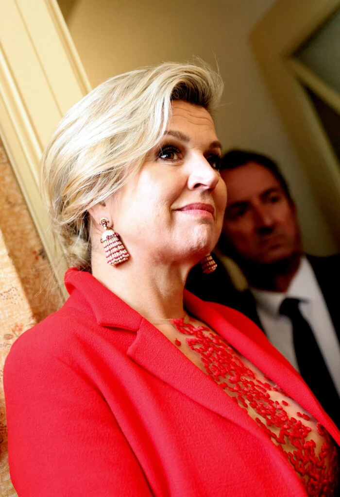 Se trata de un outfit integrado por un vestido con sutiles transparencias, un tapado rojo y zapatos al tono, que la reina de Países Bajos rescató de su placard y que había usado en al menos dos oportunidades previamente, en el año 2018.