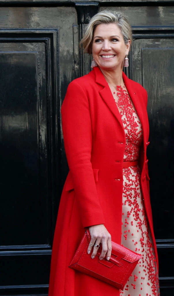 Elegantísima, la argentina deslumbró con el look, totalmente diseñado por la casa Natan Couture, una de sus preferidas. El vestido elegido por la reina era midi, con un bordado degradé sobre tul color piel. En cuanto al tapado, era largo, entallado, super sentado. Y los stilettos de gamuza al tono. Máxima llevó además un clutch de la firma Sophie Habsburg al tono.