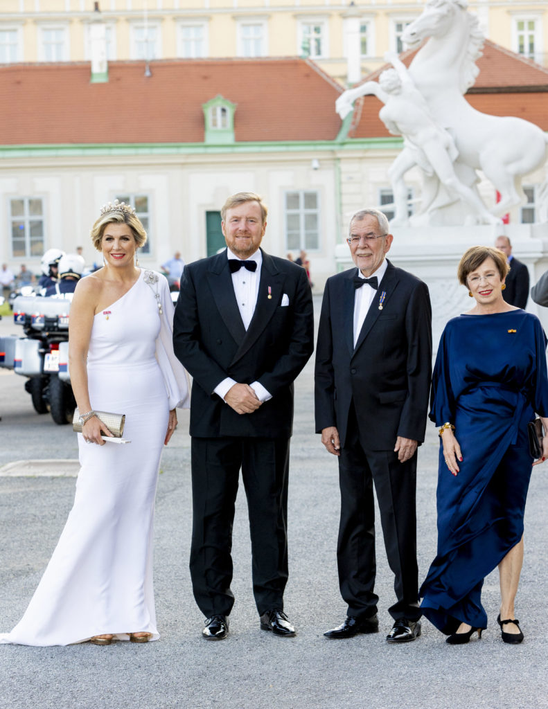 Después de deslumbrar con un vestido rojo en el primer día de visita de Estado a Austria, Máxima Zorreguieta cautivó a todos con un look total white para la cena de gala en el museo Belvedere de Viena.