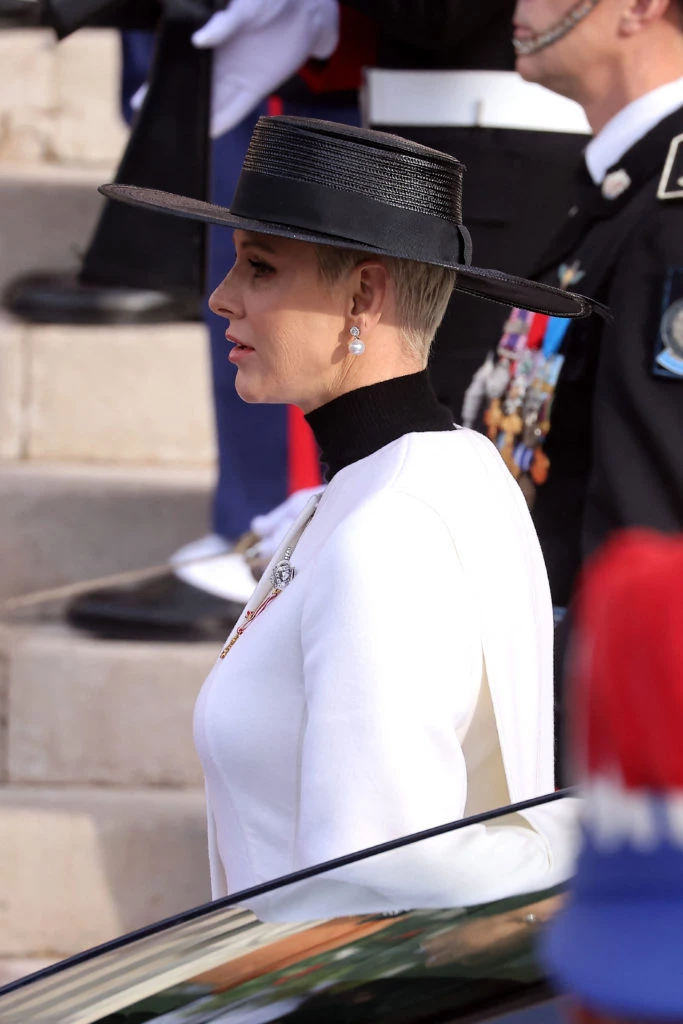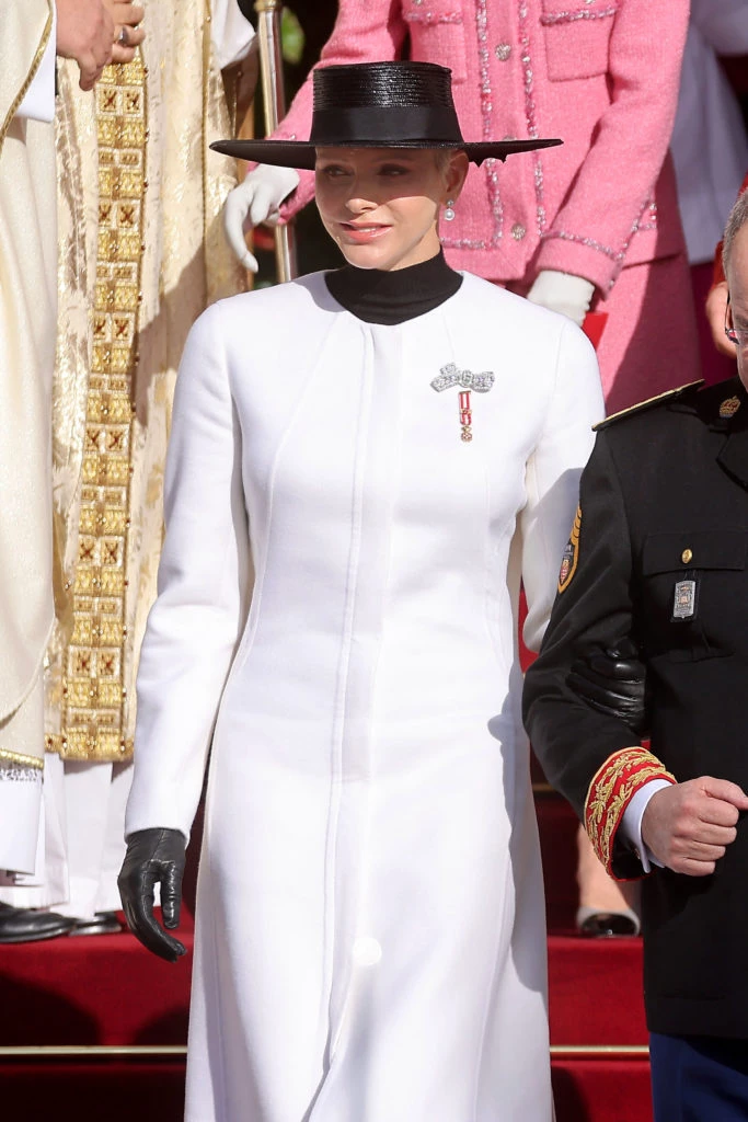 Charlene llevó un abrigo largo en color blanco combinado con un sombrero tipo pamela negra, guantes de cuero y broche joya. Con este estilismo la princesa se convirtió en la mejor vestida en el acto oficiado por el arzobispo Dominique Marie David.