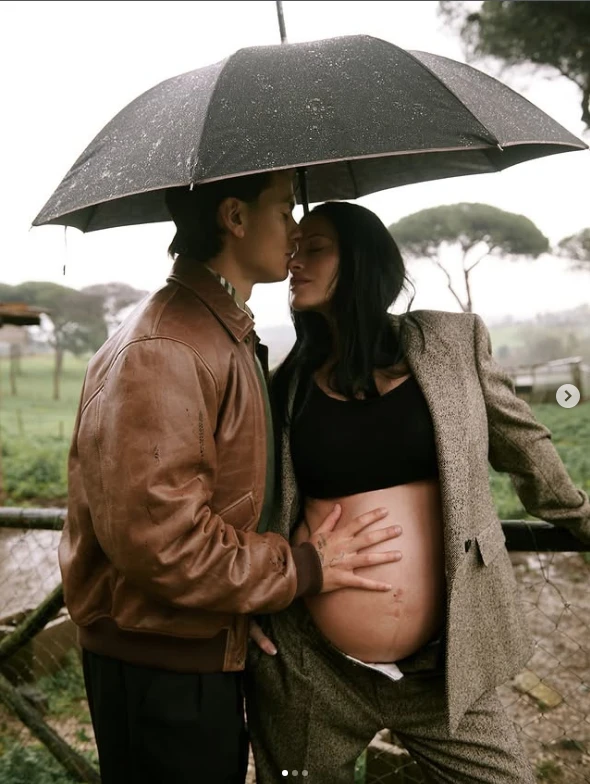Oriana lo lleva en versión maternidad chic, combinándolo con actitud y naturalidad. Incluso bajo la lluvia y en escenarios más descontracturados, el traje mantiene su elegancia.