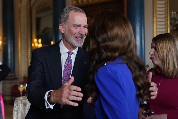 Tras la comida oficial junto a gobernadores y primeros ministros del Reino Unido celebrada en Buckingham Palace este mediodía, el rey Carlos, la reina Camila, los príncipes de Gales y el resto de miembros oficiales se cambiaron de look para presidir una recepción de bienvenida con la presencia de más de 2.000 invitados.