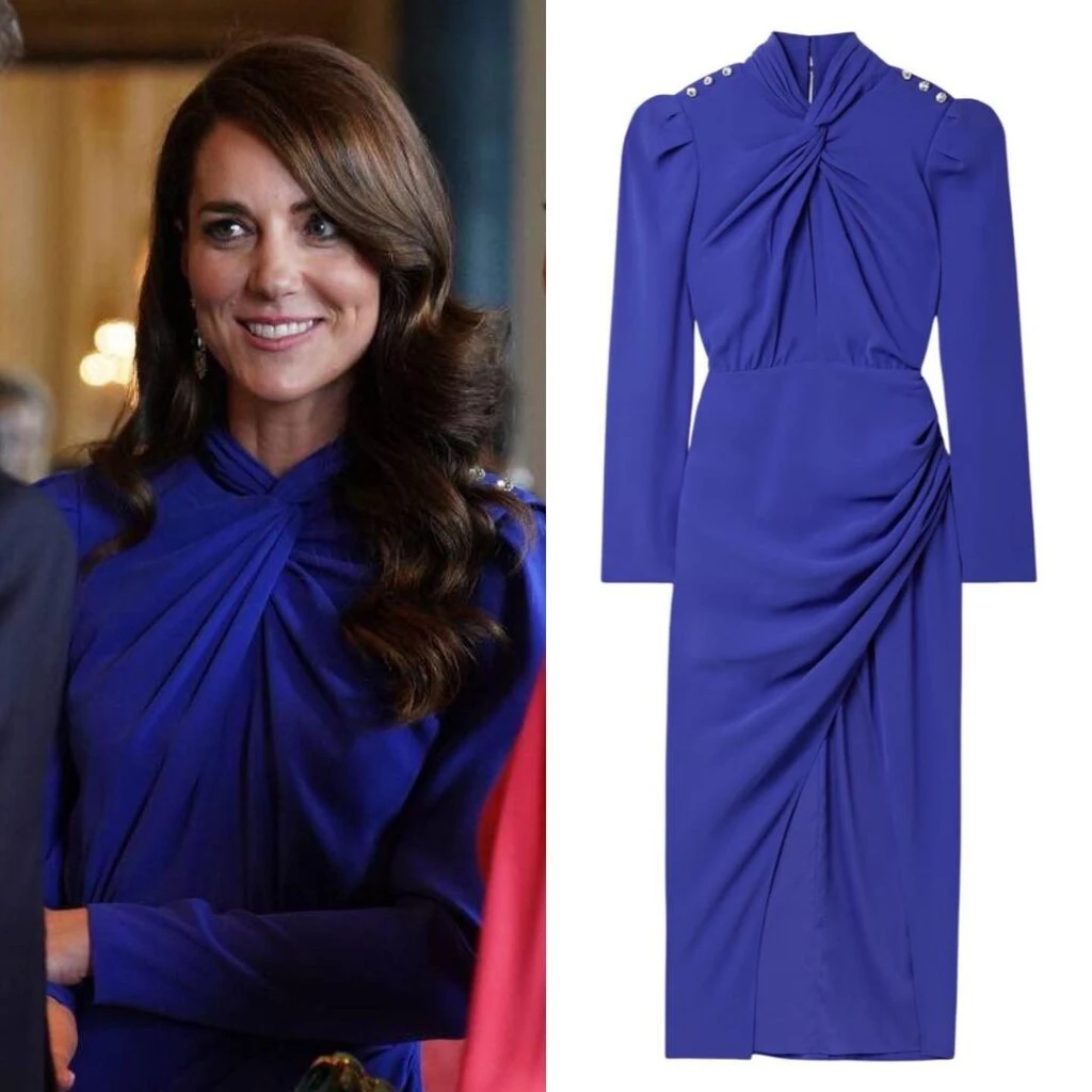 Kate lució un vestido es de Self-Portrait, que lo llevó con mucha elegancia. Confeccionado con un tejido de crepé elástico en color azul Klein, el diseño tenía un original cuello con detalle nudo, costuras fruncidas en la parte superior, manga larga, hombros voluminosos y minibotones dorados decorando tanto los puños como las hombreras.