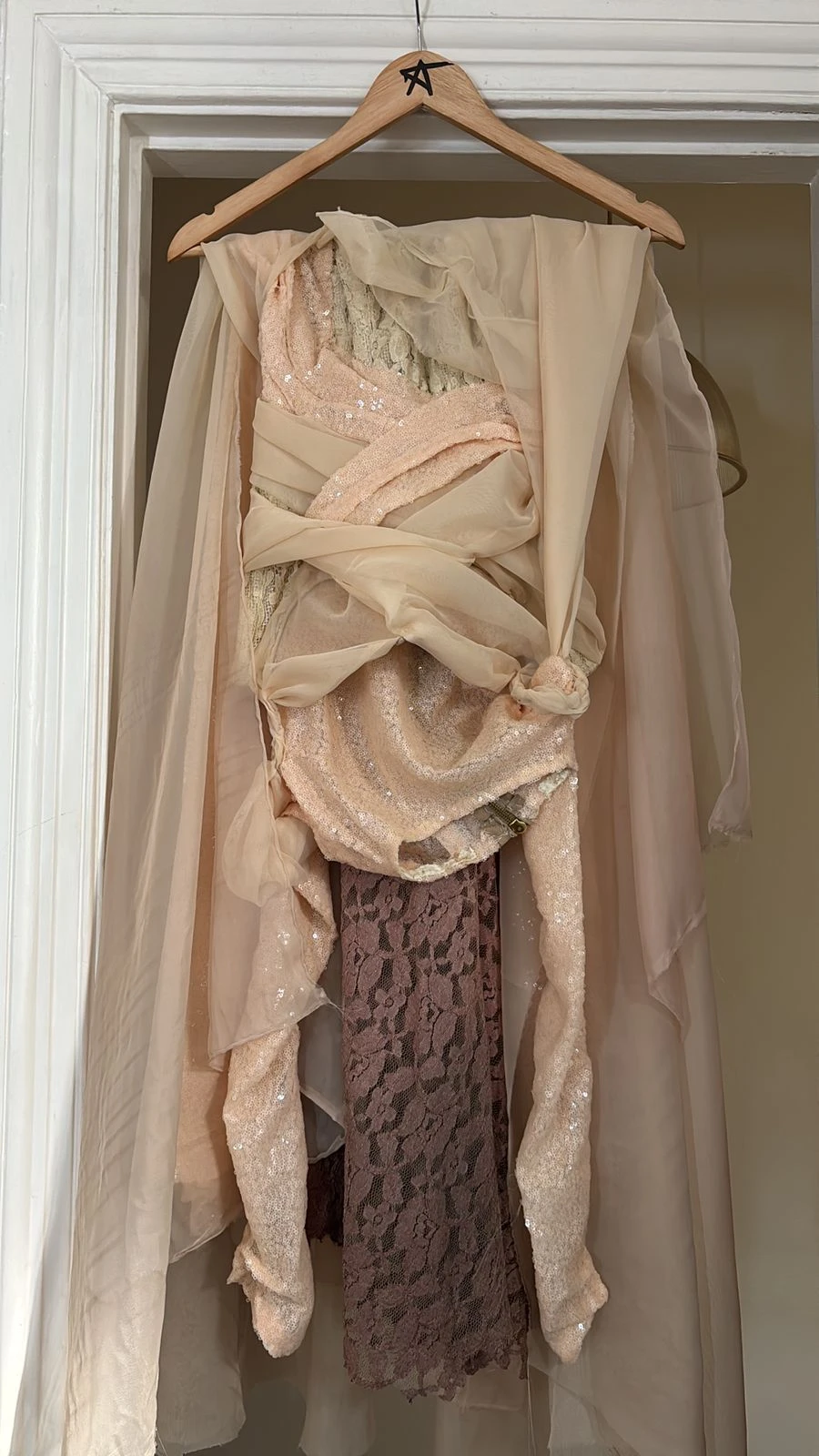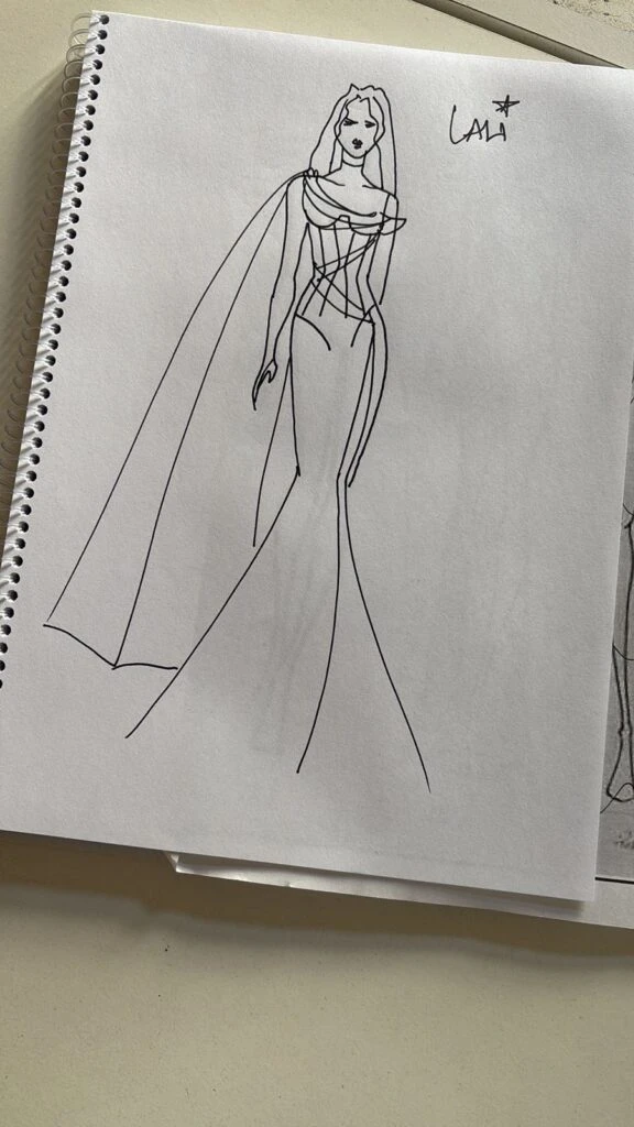 El diseñador explicó que la inspiración detrás de esta pieza fue crear un vestido que pareciera entre armado y desarmado, como metáfora de la resiliencia: aquello desgarrado que se transforma en bello. El resultado fue un diseño con movimientos orgánicos, que abraza el cuerpo de Lali y a la vez transmite libertad en cada gesto sobre el escenario.