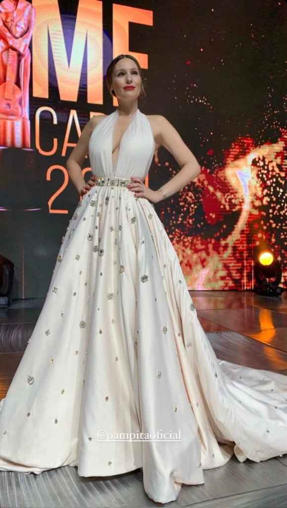 Para la conducción de los premios Martín Fierro de Cable Pampita lució tres vestidos en donde la elegancia y la sensualidad no quedaron de lado. Luego de un look total red by María Gorof y un vestido negro con capa by Gabriel Lage, la modelo cerró la noche de la mano de Jorge Rey.