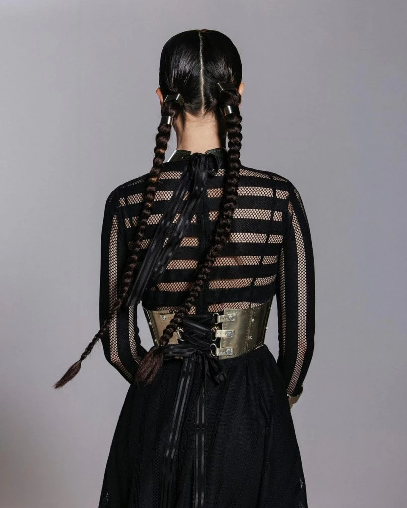 Por otro lado, Oreiro usó un vestido de tela de rejilla a rayas, que recuerda mucho al utilizado por Addams. Pero este diseño es completamente modernizado ya que cuenta con un cuello americano, corset y brazaletes metalizados. El resultado es un sobrio homenaje al look gótico de Merlina, pero con un estilo más sofisticado y chic.