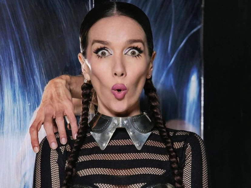 Por otro lado, Oreiro usó un vestido de tela de rejilla a rayas, que recuerda mucho al utilizado por Addams. Pero este diseño es completamente modernizado ya que cuenta con un cuello americano, corset y brazaletes metalizados. El resultado es un sobrio homenaje al look gótico de Merlina, pero con un estilo más sofisticado y chic.