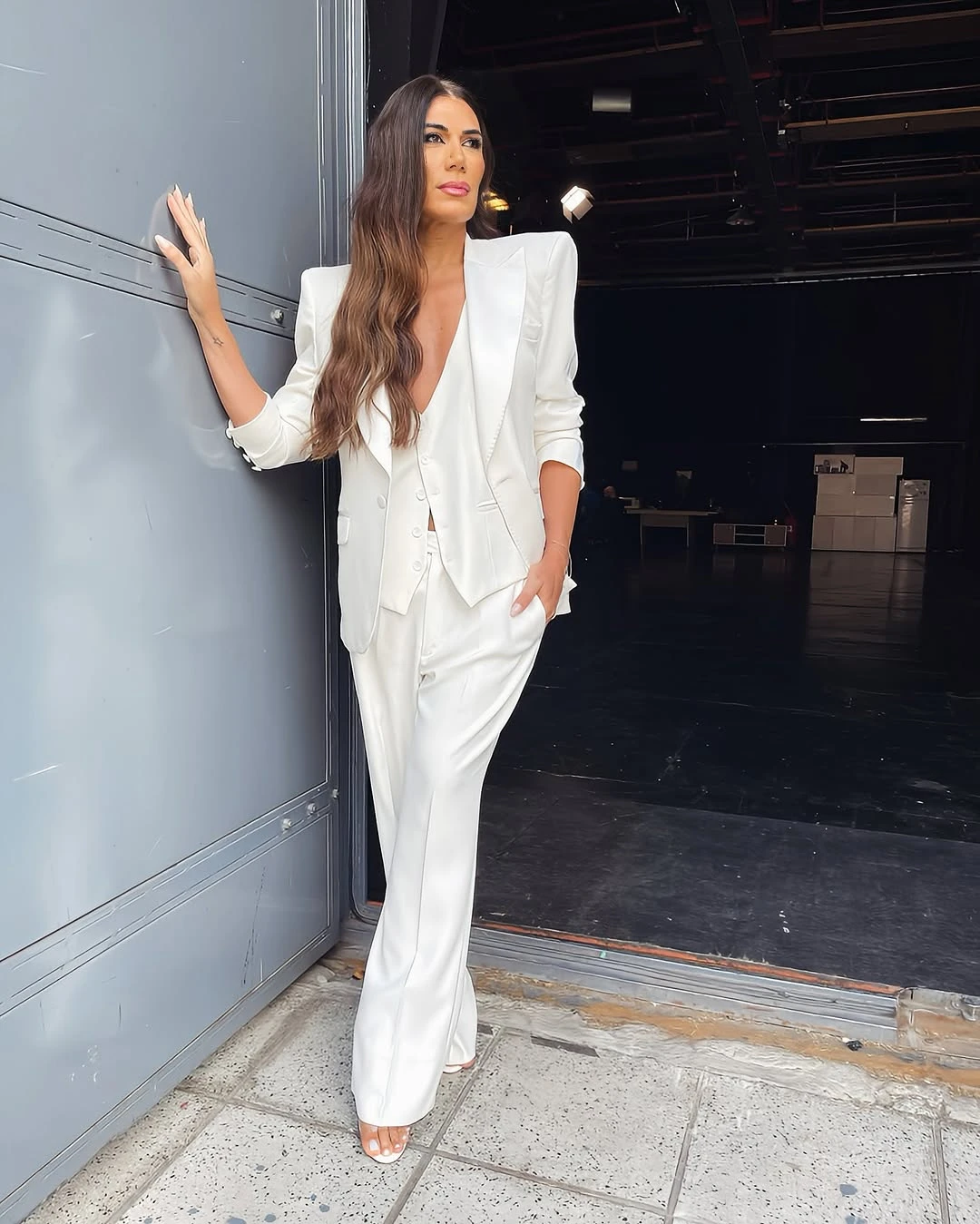 La flamante conductora de Los profesionales de siempre (el Nueve), compartió un outfit sastrero, compuesto por pantalón, blazer y chaleco. Lo acompañó con sandalias al tono. Un look minimalista que tenía como único detalle una flor de tela en una de las solapas.