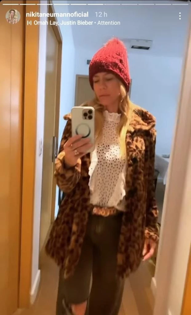 En una foto tomada frente a su espejo, Nicole se mostró con un gorro de lana en tono rojo, blusa bordada en color blanca, jean oscuro wide leg con rotura a la altura de la rodilla y un tapado largo animal print de piel sintético.