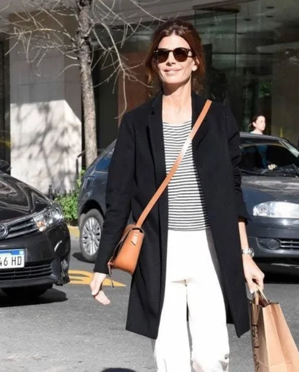 Juliana eligió un look armado con básicos para ir a votar este domingo: remera rayada navy, su prenda favorita, un jean, y un abrigo liviano en color camel.