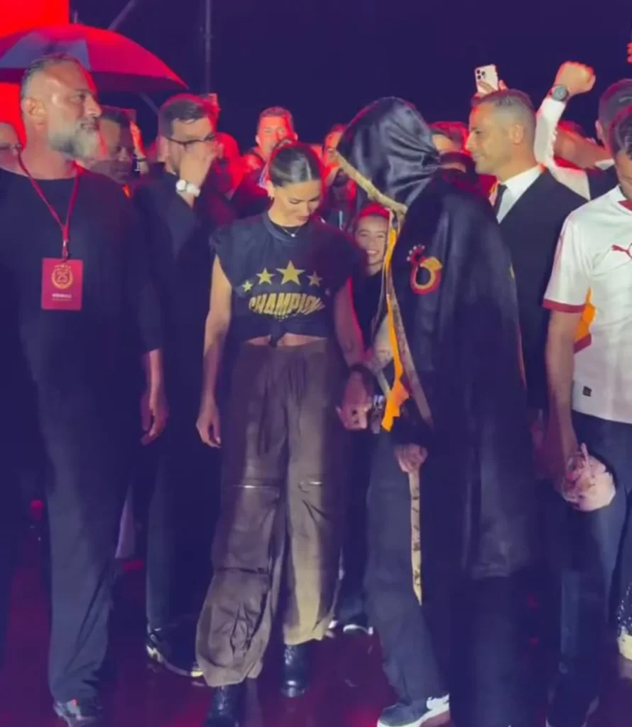 Por supuesto, el look de la China no pasó desapercibido y en este caso, optó por algo relajado y con una clara referencia al futbolista. La joven llevó un crop top negro sin mangas, estampado con estrellas doradas y la palabra “CHAMPIONS”, anudado al frente para marcar la cintura. La prenda, con aires de camiseta de fútbol intervenida, sumó un guiño directo al triunfo del equipo turco y al clima festivo de la noche.